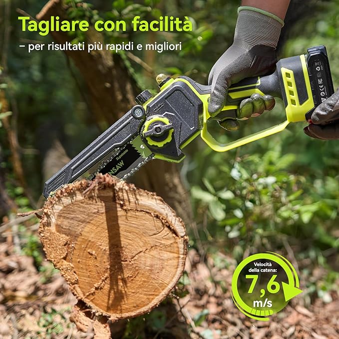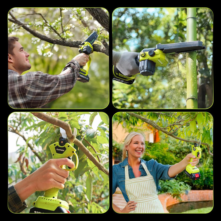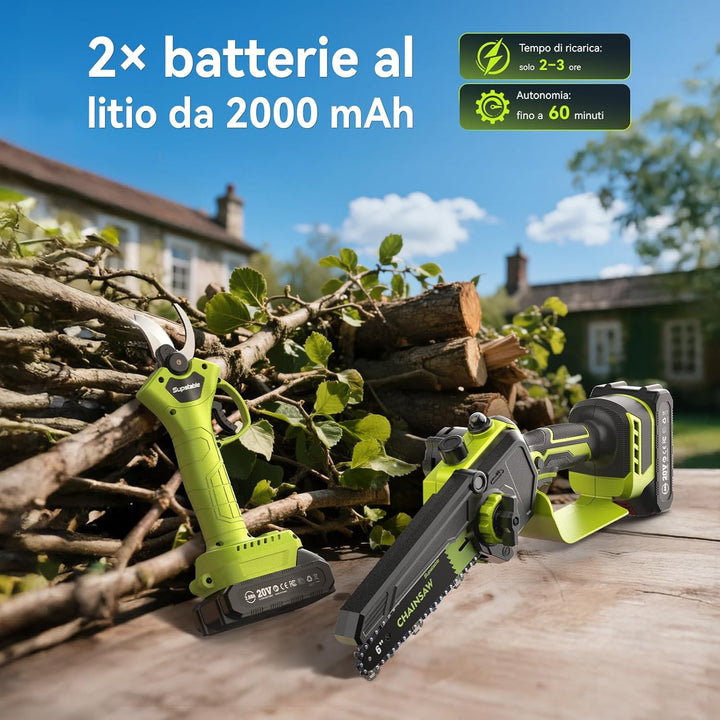 KIT Mini-Motosega 4 in 1 con Forbici da potatura, Asta Telescopica e 2 Batterie